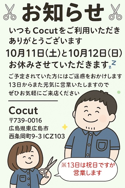#東広島 #西条 #理容室 #カット専門店 #予約不要 #ヘアカット #西条酒まつり #10月営業日程