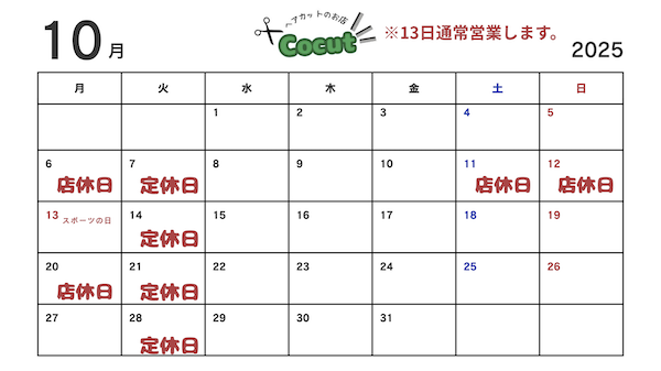 10月13日は祝日ですが、特別に通常通り営業いたしますので、ぜひお気軽にご来店ください。
