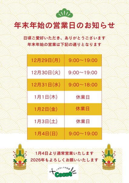 年末は12月31日まで営業しておりますので、新年を気持ちよく迎えたい方はぜひお立ち寄りください。